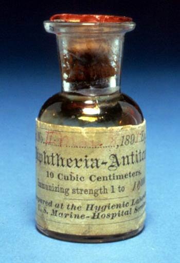 Eine der ersten Flaschen (1895) mit Diphtherie-Antitoxin, hergestellt im Hygienelaboratorium, aus dem 1930 das NIH hervorging. Das Diphtherie-Antitoxin wurde hergestellt, indem Pferden oder Ziegen zunehmend konzentrierte Dosen von Diphtheriebakterien injiziert wurden. Anschließend wurden den Tieren Blut abgenommen, ihr Blutserum gesammelt und als Antitoxin in Flaschen abgefüllt. Bei der Injektion in den Körper eines an Diphtherie erkrankten Patienten neutralisierten die Antikörper im Pferdeserum das Toxin, das die Symptome des Patienten verursachte.